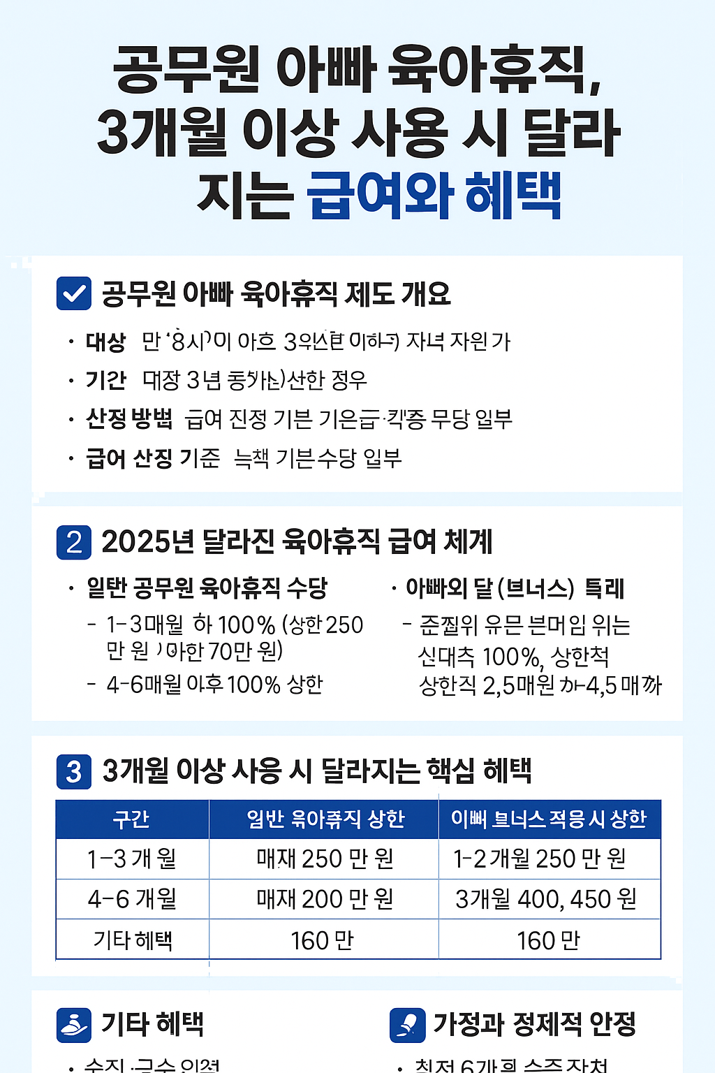 최근 공무원 아빠들의 육아휴직 활용률이 빠르게 증가하고 있습니다. 특히 3개월 이상 육아휴직을 사용할 경우, 급여와 혜택이 어떻게 달라지는지가 가장 큰 관심사인데요. 이번 글에서는 2025년 최신 개정 기준으로, 공무원 아빠 육아휴직의 급여·수당 변화와 혜택을 정리해 드리겠습니다.