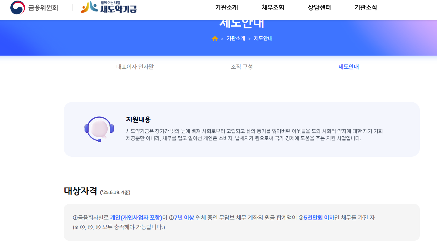 | 지원형태 | 채무조정(금리인하, 상환유예, 원금감면), 재창업자금 |