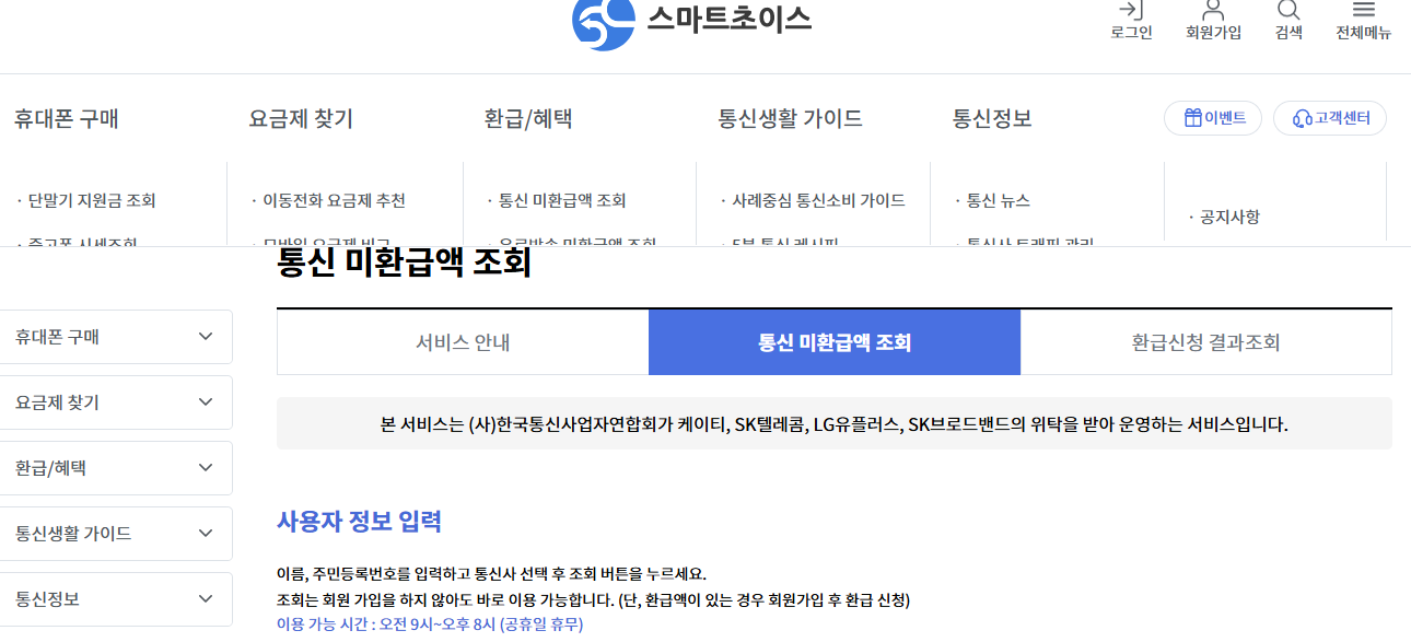 - 통신 미환급액 통합 조회·신청(스마트초이스) — 회원가입 없이 조회, 환급은 회원가입 후 신청, 09:00~20:00 운영. 스마트초이스